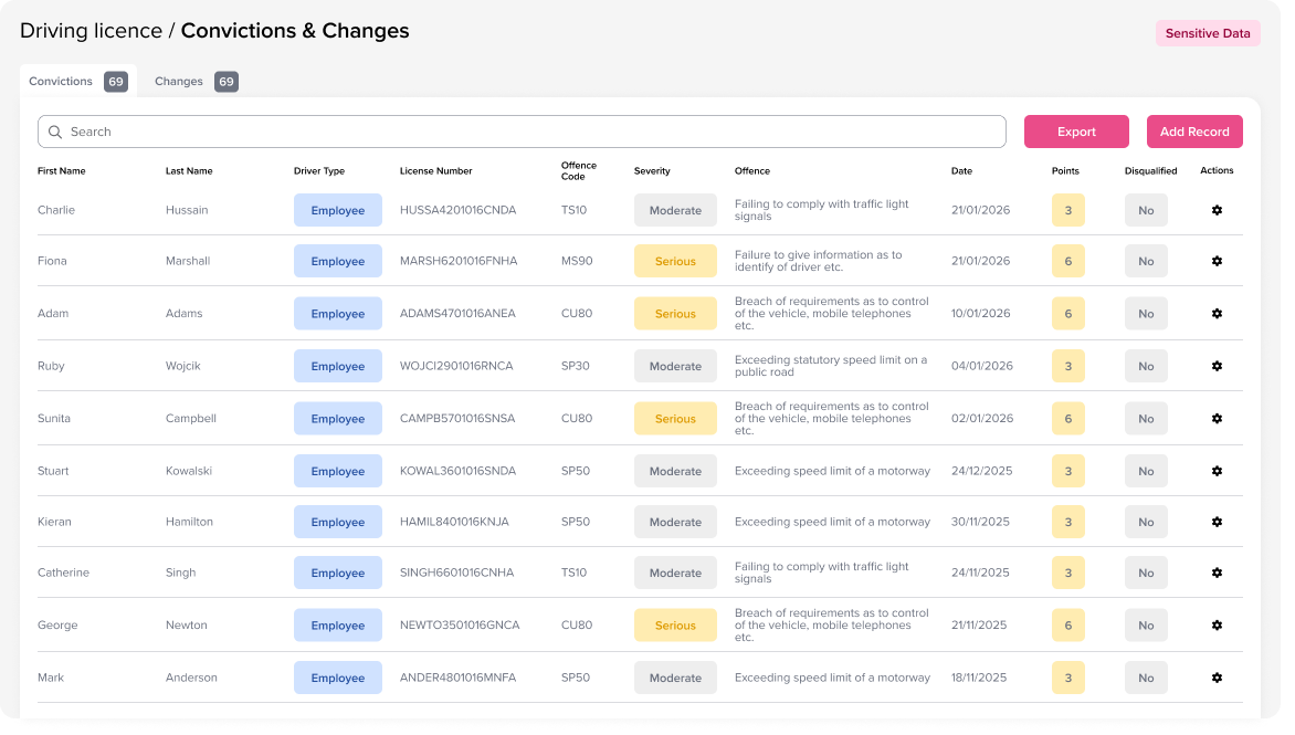 Each driver record stays live and auditable, giving you clear visibility of who can legally drive today and who requires action. Built-in risk scoring and GDPR-compliant consent tracking ensure safety, compliance and accountability without manual chasing.