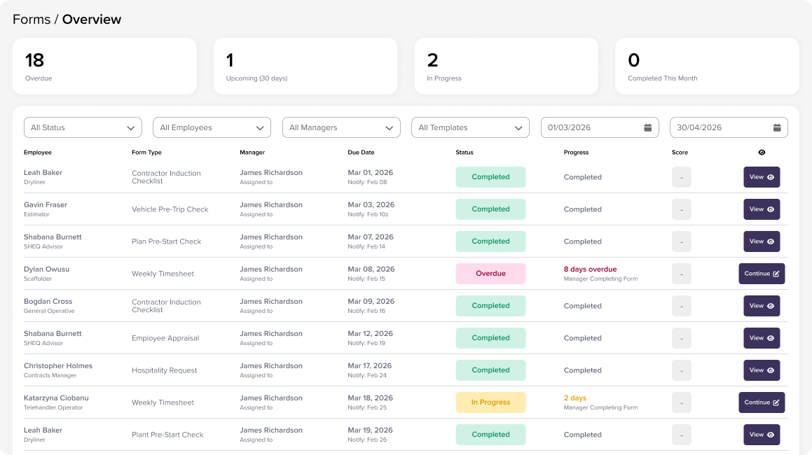 Build, assign and track forms digitally, so responses are captured consistently, visible instantly and never lost on paper.