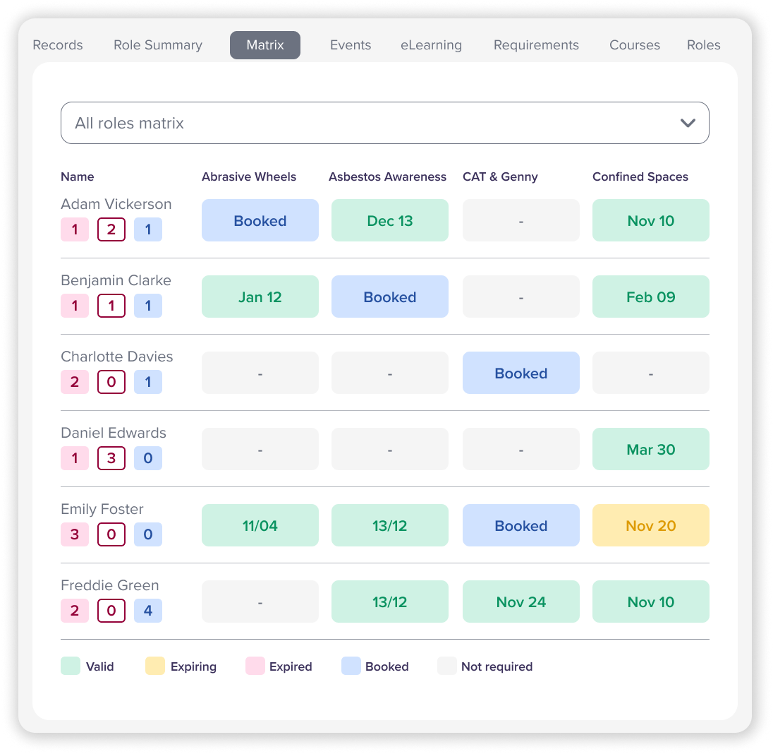 Our Training Matrix gives you a real-time, colour-coded view of training status and gaps in one clear dashboard, so you can instantly see where action is needed.